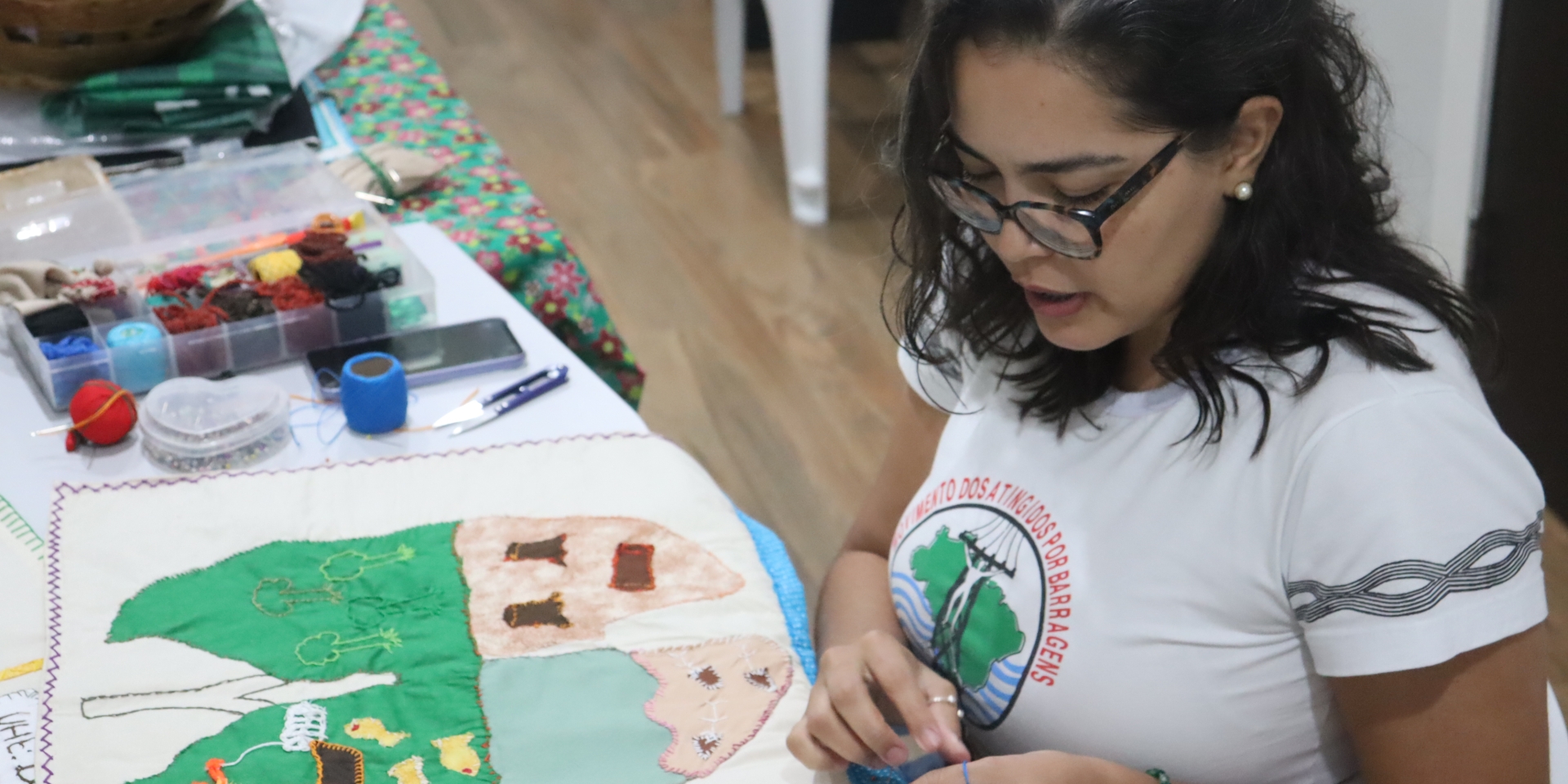 These works are more than art – they are testimonies. Originally developed as a form of resistance during the Chilean dictatorship, the arpillera technique has been adapted by the Movimento dos Atingidos por Barragens (MAB – Movement of People Affected by Dams) in Brazil. For over a decade, women in the Amazon have used needle, thread, and fabric scraps to narrate their lived experiences of environmental destruction, forced displacement, and the impacts of the climate crisis